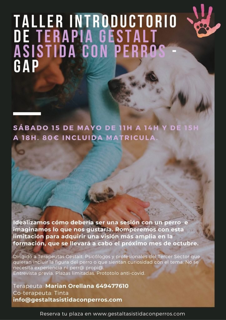 Taller introductorio de Terapia Gestalt Asistida con Perros (GAP). Sábado 15 de mayo de 2021 de 11h a 14h y de 15h a 18h. Precio: matrícula + taller 80€. MARA Psicología & Arte. Calle del Buen Suceso, 25. 28008 Madrid. Imprescindible confirmar asistencia